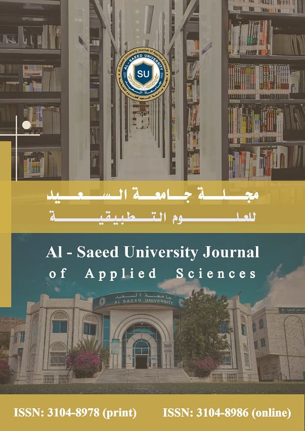 عن المجلة: مجلة جامعة السعيد للعلوم التطبيقية هي مجلة علمية محكمة مفهرسة نصف سنوية تصدر عن جامعة السعيد تهدف إلى نشر البحوث العلمية المبتكرة الأصيلة في مجال العلوم الطبية، والهندسية، والبيئية، والزراعية، والطبيعية، وعلوم الكمبيوتر، التي تستجيب لشروط وضوابط البحث العلمي، ووفقًا للمعايير الدولية، وهي تحمل رقمي التصنيف الدولي (ISSN: 3104-8978) للنسخة المطبوعة،و(ISSN: 3104-8986) للنسخة الإلكترونية وتصدر بشكل دوري منتظم الكترونيًا وورقيًا، وتنشر بحوثها باللغة العربية والإنجليزي، كما أنها متاحة للقراءة والتحميل (Open-Access) على مبدأ إتاحة الوصول للمعلومات بسهولة.